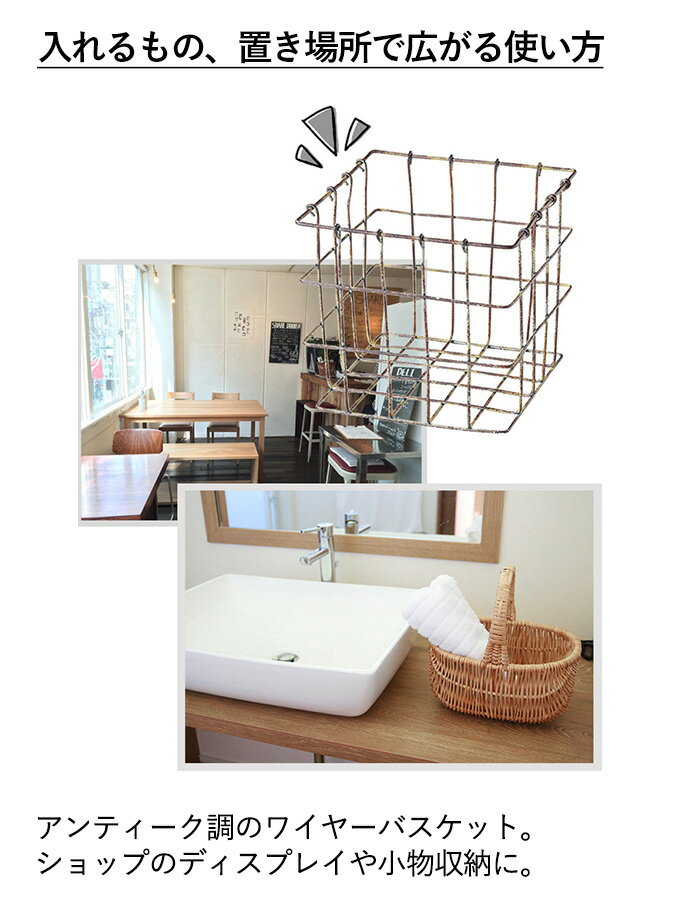 『ワイヤー バスケット』 バスケット かご 籠 カゴ 小物入れ 小物収納 収納カゴ 整理カゴ 収納バスケット 店舗什器 ワイヤーバスケット 衣類収納 収納ボックス ミニバスケット タオル入れ タオル収納 シンプル ナチュラル 北欧 おしゃれ アンティーク調 角型 洗面所 トイレ