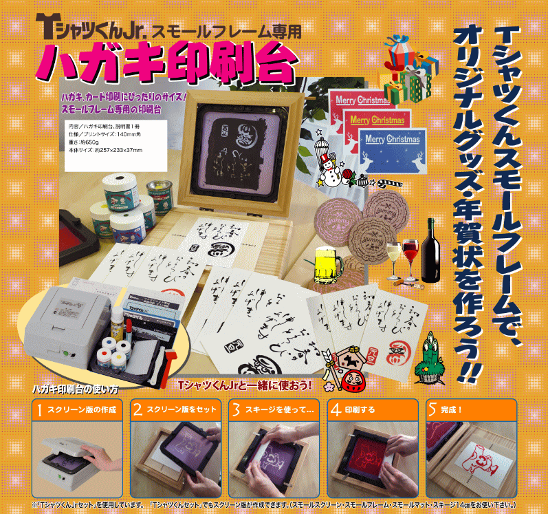 品名 ハガキ印刷台 特長 スモールフレームを固定できる印刷台 Tシャツくんをお持ちの場合は、スモールフレーム スモールスクリーン/スモールマット/スキージ14cmが必要になります。